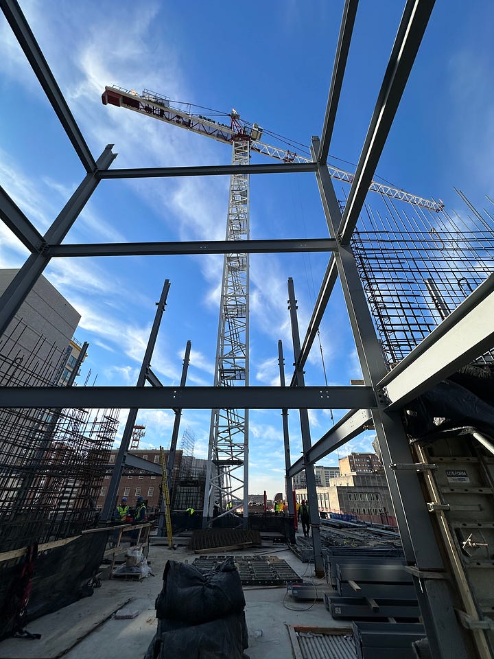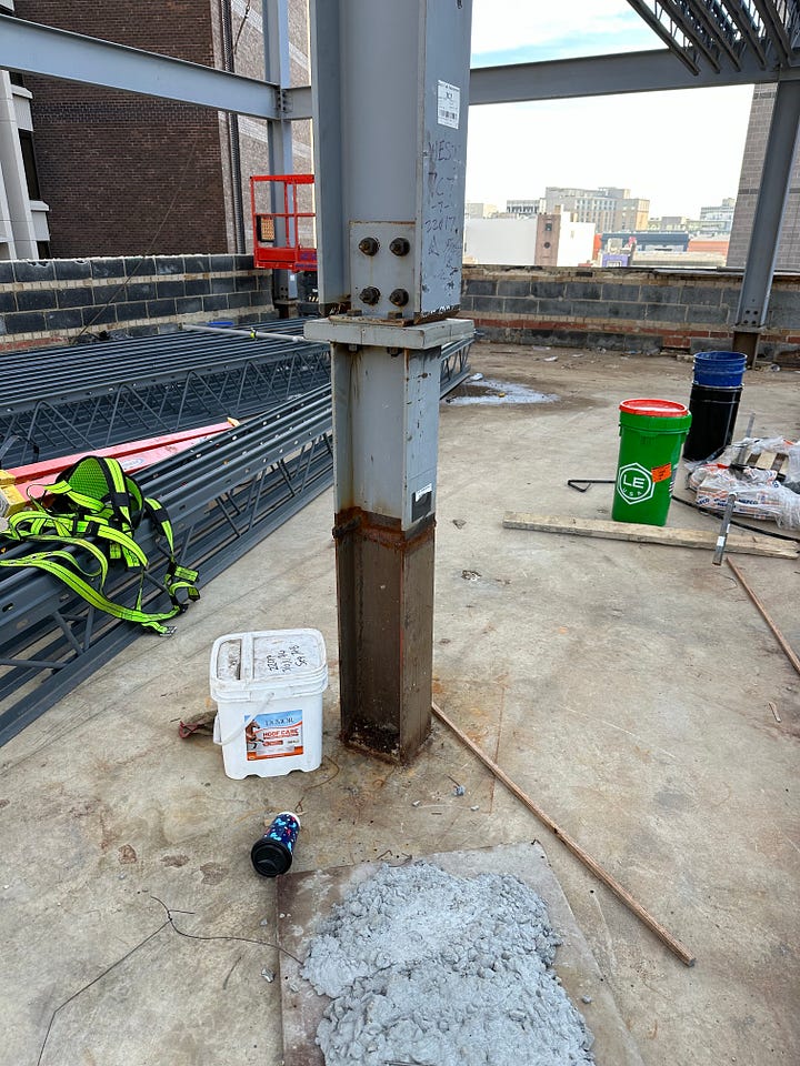 Cut the roof off and start adding new steel framing for the new upper floors! The photo on the left below shows an example where the new steel framing system meets the old steel framing to form one continuous building structure. The photo on the right shows the progress to date on the new steel framing system, which will allow for 5 additional stories. For those interested, the new addition will use the Hambro steel framing system.